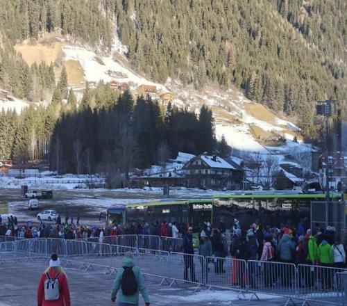 更深層的原因,在於地形本身的限製。安泰塞爾瓦冬季兩項競技場位於海拔1600米以上的山穀盡頭,道路狹窄、承載能力有限。冬奧會期間,當地實施三層交通限製區管理,所有車輛須持通行證進入核心區域。絕大多數觀眾要先乘坐火車或公交到達指定換乘點,再排隊搭乘接駁車上山。