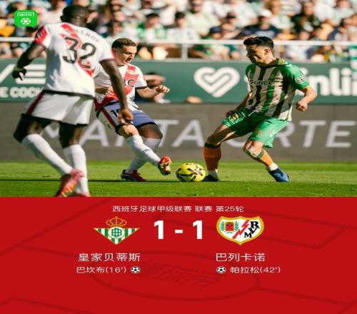 北京時間2月21日西班牙足球甲級聯賽第25輪,皇家貝蒂斯主場對陣巴列卡諾。巴坎布率先破門。帕拉鬆扳平比分。最終比分皇家貝蒂斯1-1巴列卡諾。