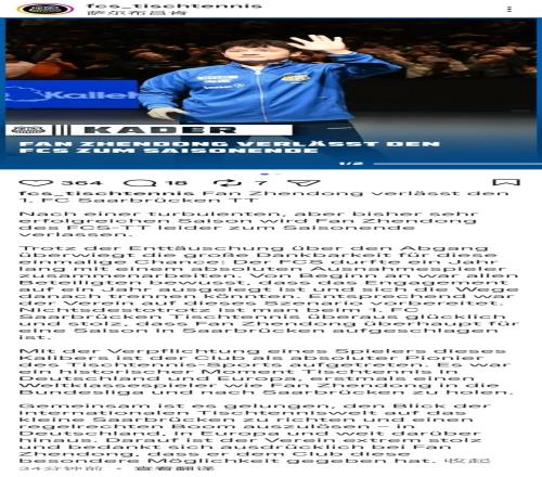 3月16日,德國薩爾布呂肯乒乓球俱樂部官方社媒宣布,樊振東將在本賽季結束後離開球隊。