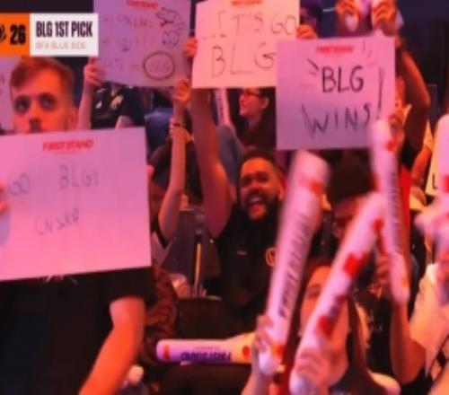 CNKR巴西主場許多觀眾舉著BLG應援牌為其加油